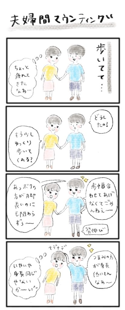 巷では、彼氏は自分より背が高い方がいいだとか、180cm以上が理想なんていう声をよく耳にします。でもそんな考え方だけに縛られてしまうのはもったいない。身長差ほぼなし夫婦の私たちならではの楽しい日常を4コマ漫画とエッセイで紹介しています。